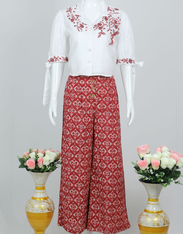 TOP-WHITE CROP TOP WITH COLLAR NECK AND THREAD WORK.