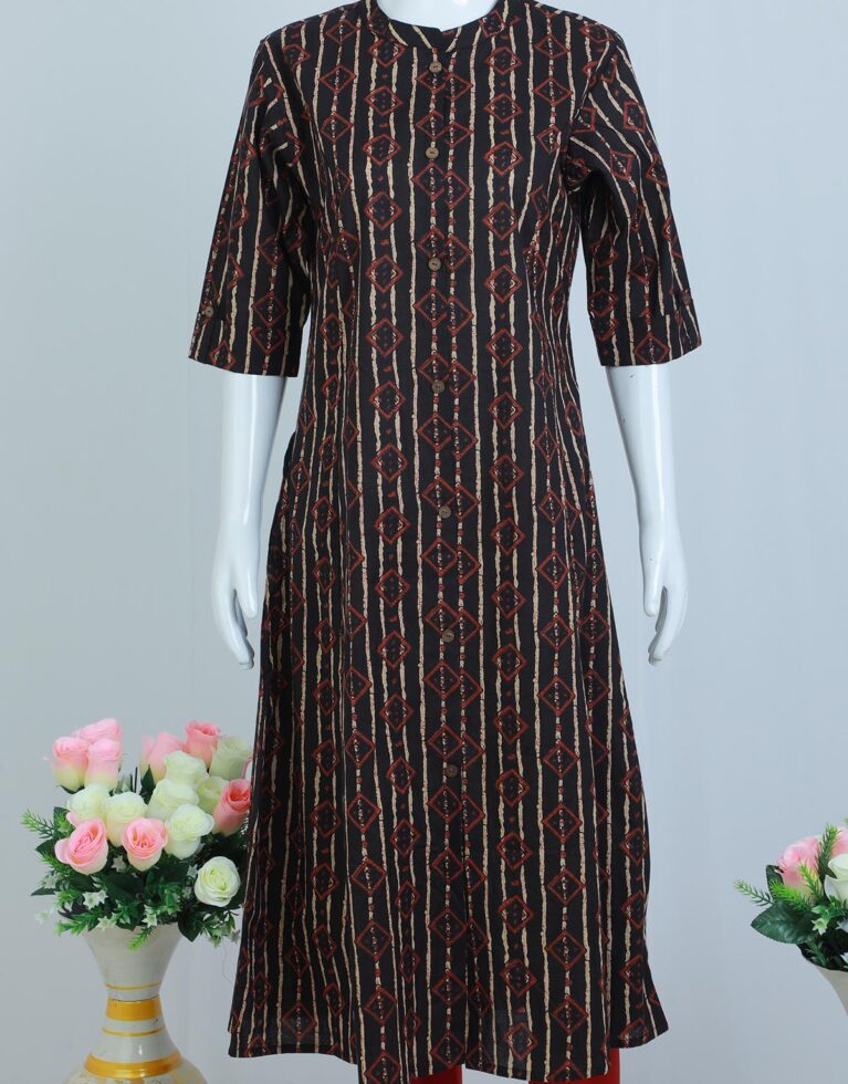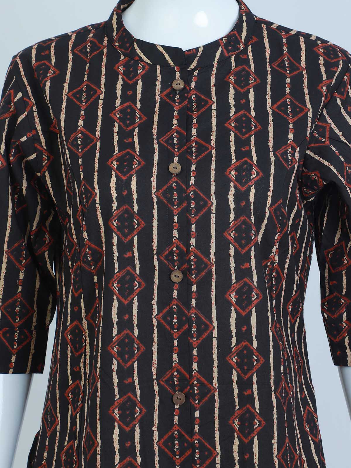 GEOMETIC PRINTED COTTON FABRIC WITH CHINESE COLLAR AND CUFF SLEEVEs
