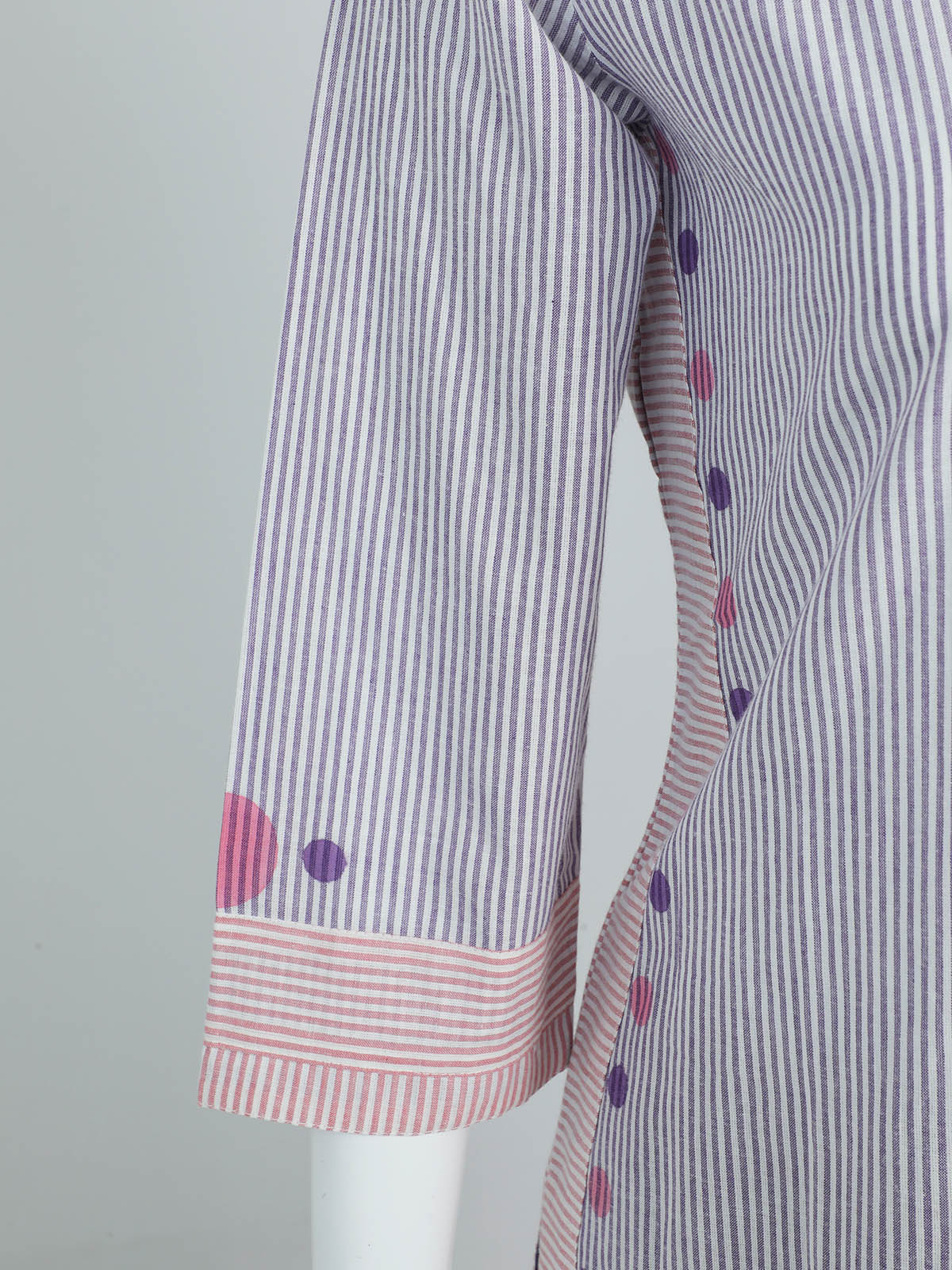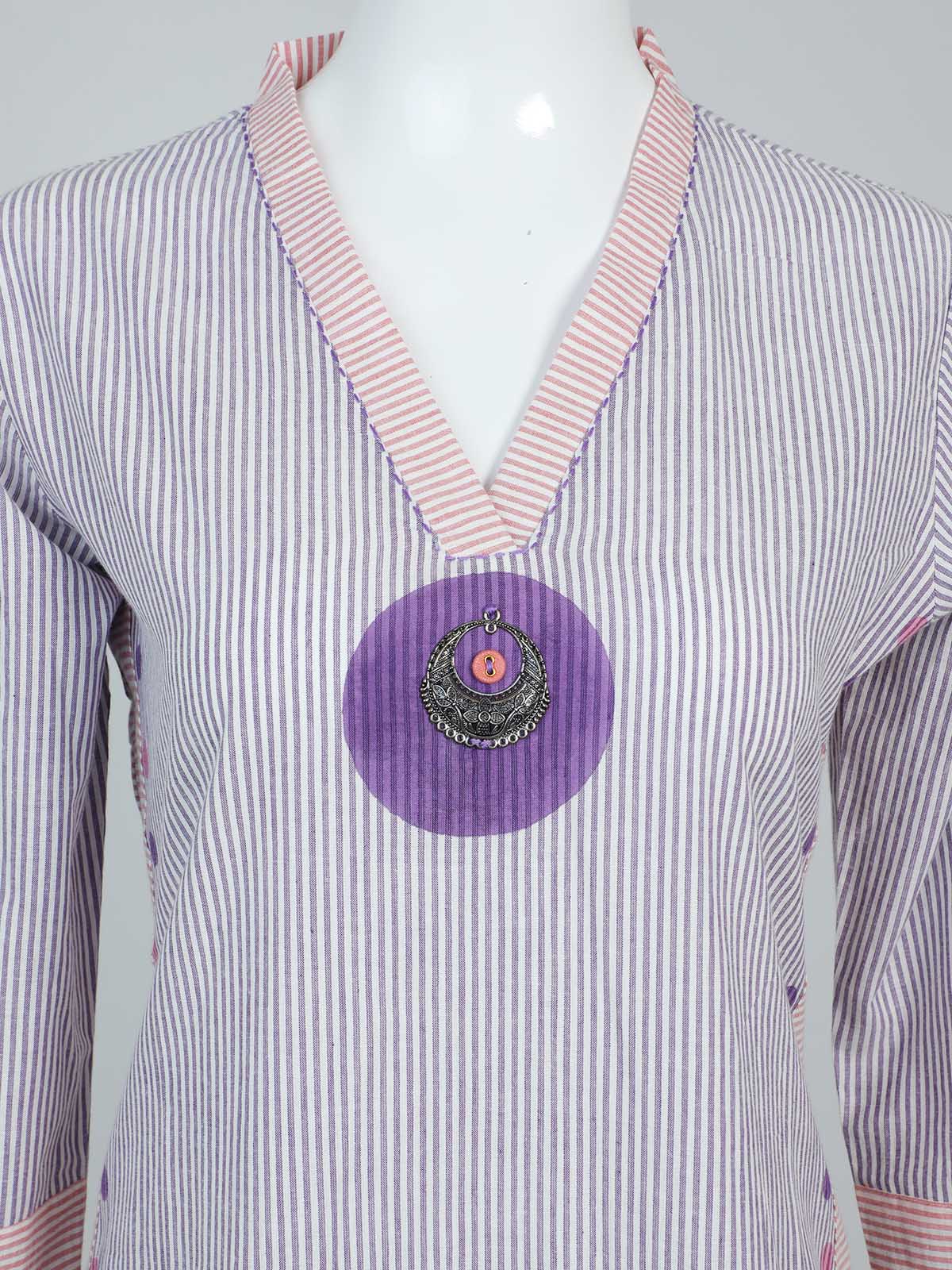 TOP – STRIPED PRINTED COTTON FABRIC WITH COLLARED V-NECK AND POLKA DOTS IN THE SIDES AND SLEEVES.