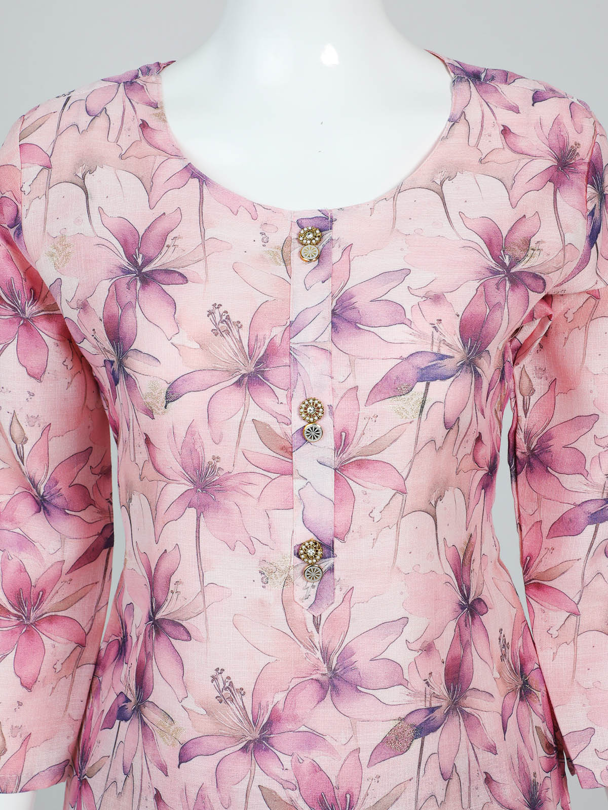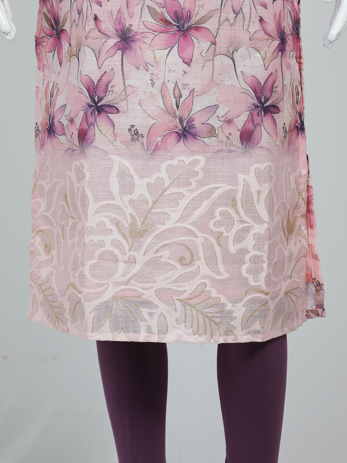 TOP – FLORAL PRINTED LINEN FABRIC WITH ZARI BORDER IN THE SLEEVES AND EMBOSSED BORDER.