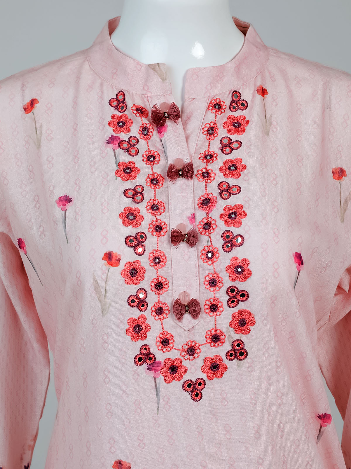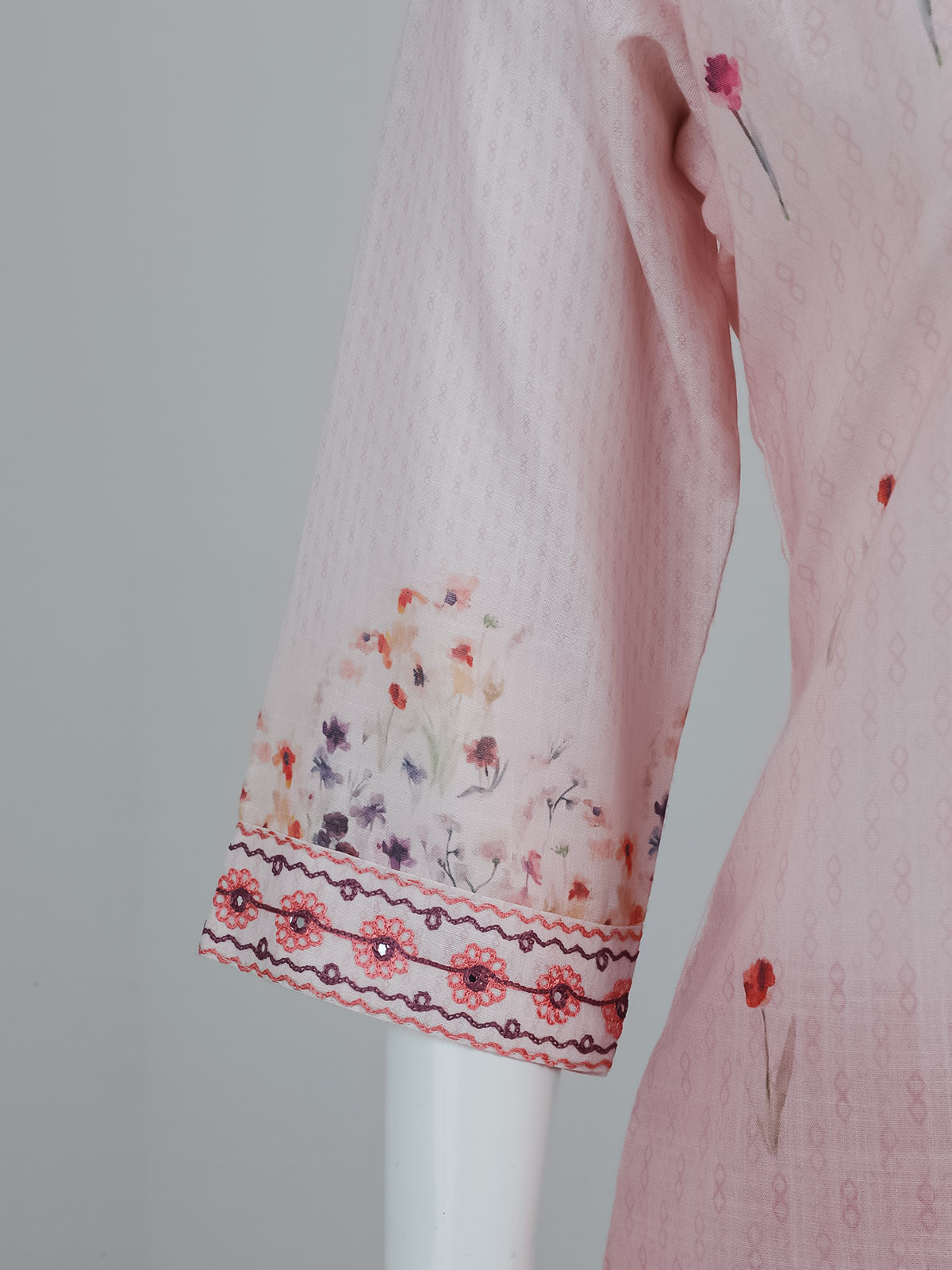 TOP – FLORAL PRINTED MULL COTTON FABRIC WITH THREAD AND MIRROR WORK IN THE YOLK,BORDER AND SLEEVES.