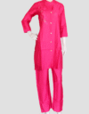 FLOWY GOWN WITH THREAD WORK IN THE NECK AND SLEEVES.