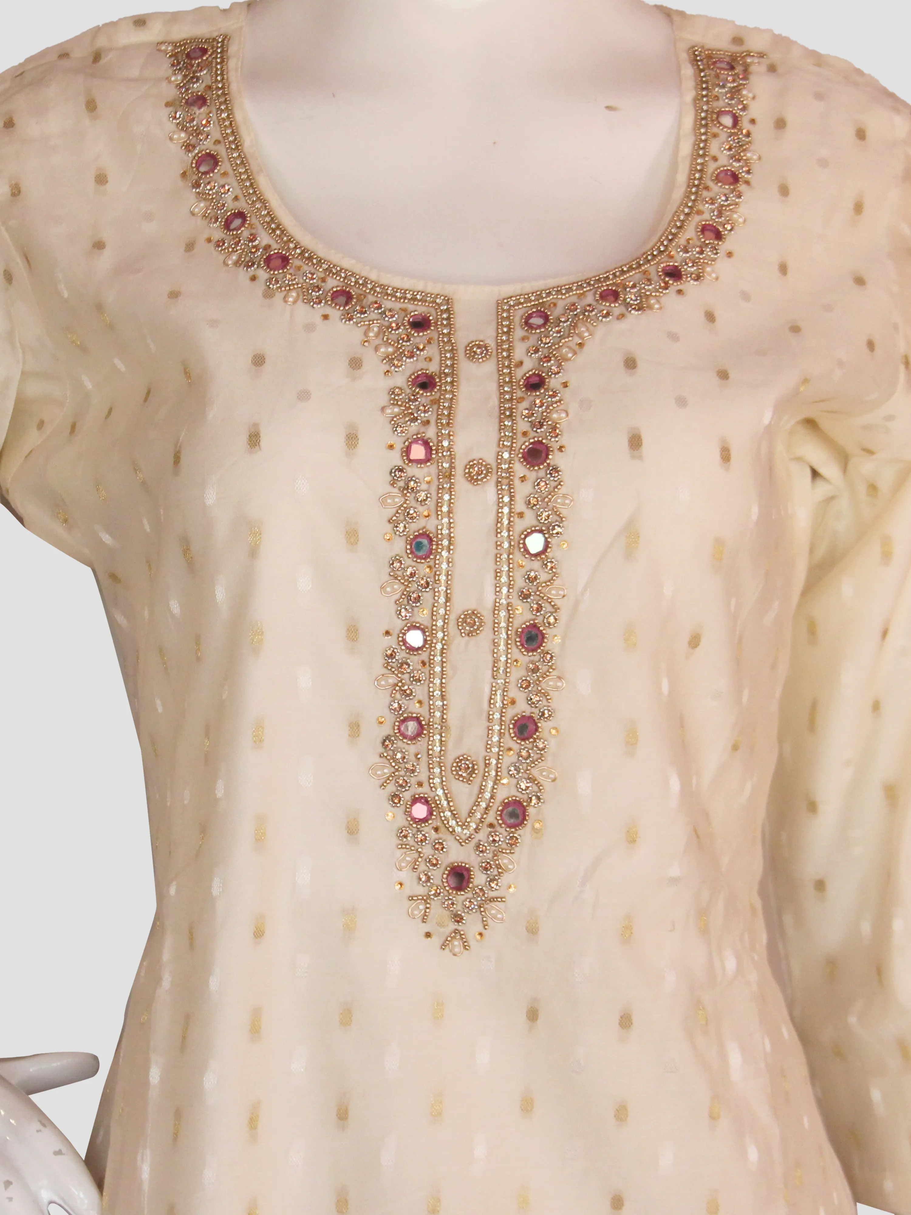 TOP – ZARI WOVEN TOP WITH INTRICATE WORK IN THE YOKE AND NECK.