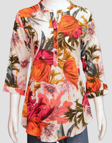 PRINTED COTTON SHORT TOP WITH CHINESE COLLAR AND CUFF SLEEVES.